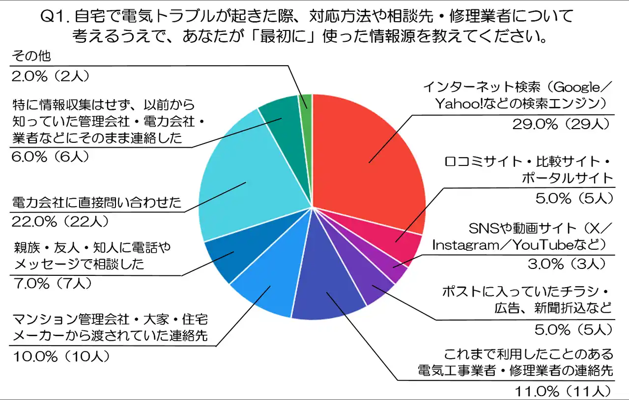 Q1. 自宅で電気トラブルが起きた際、対応方法や相談先・修理業者について考えるうえで、あなたが「最初に」使った情報源を教えてください。 |