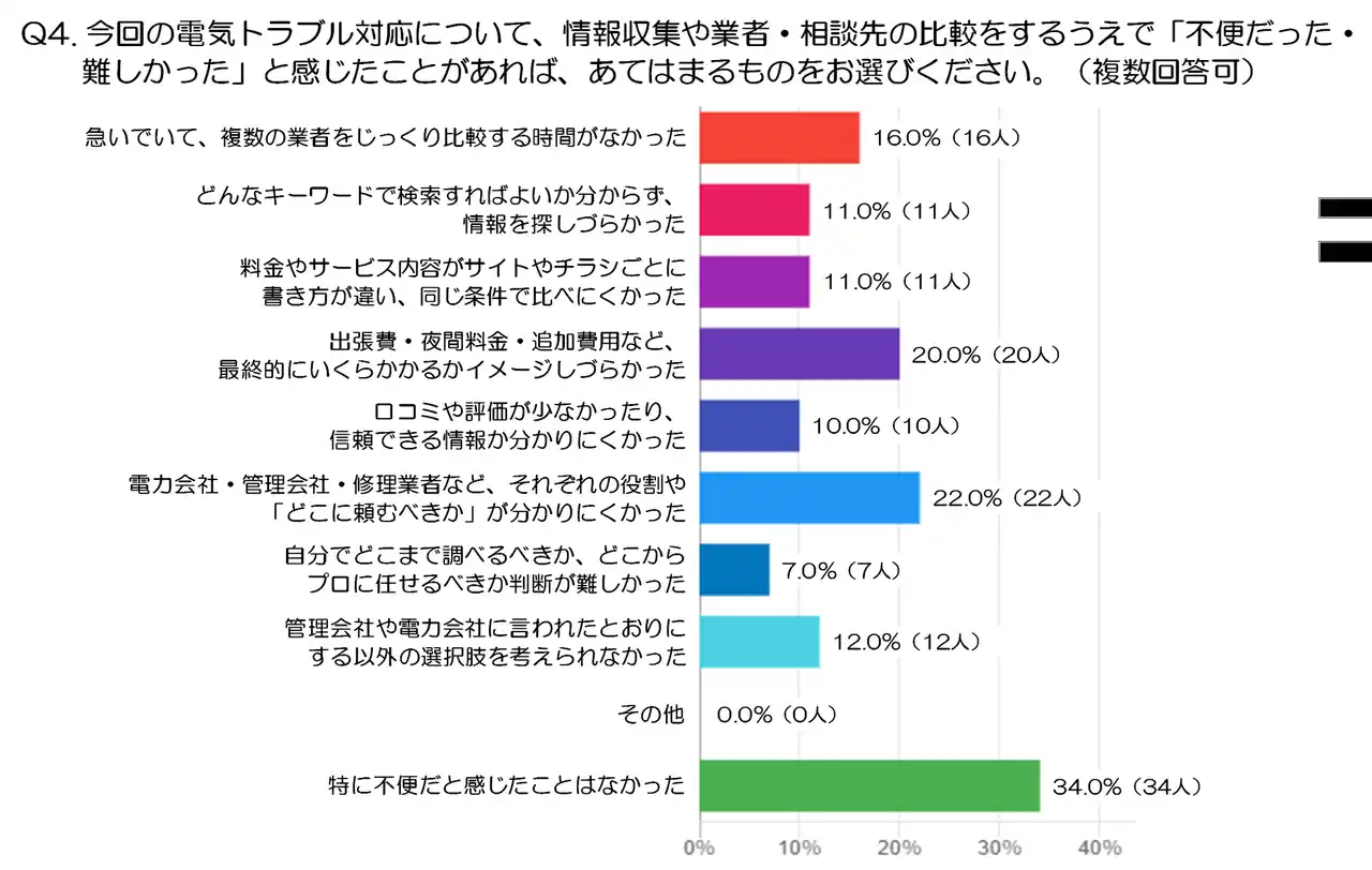 Q4. 今回の電気トラブル対応について、情報収集や業者・相談先の比較をするうえで「不便だった・難しかった」と感じたことがあれば、あてはまるものをお選びください。(複数回答可:注2)