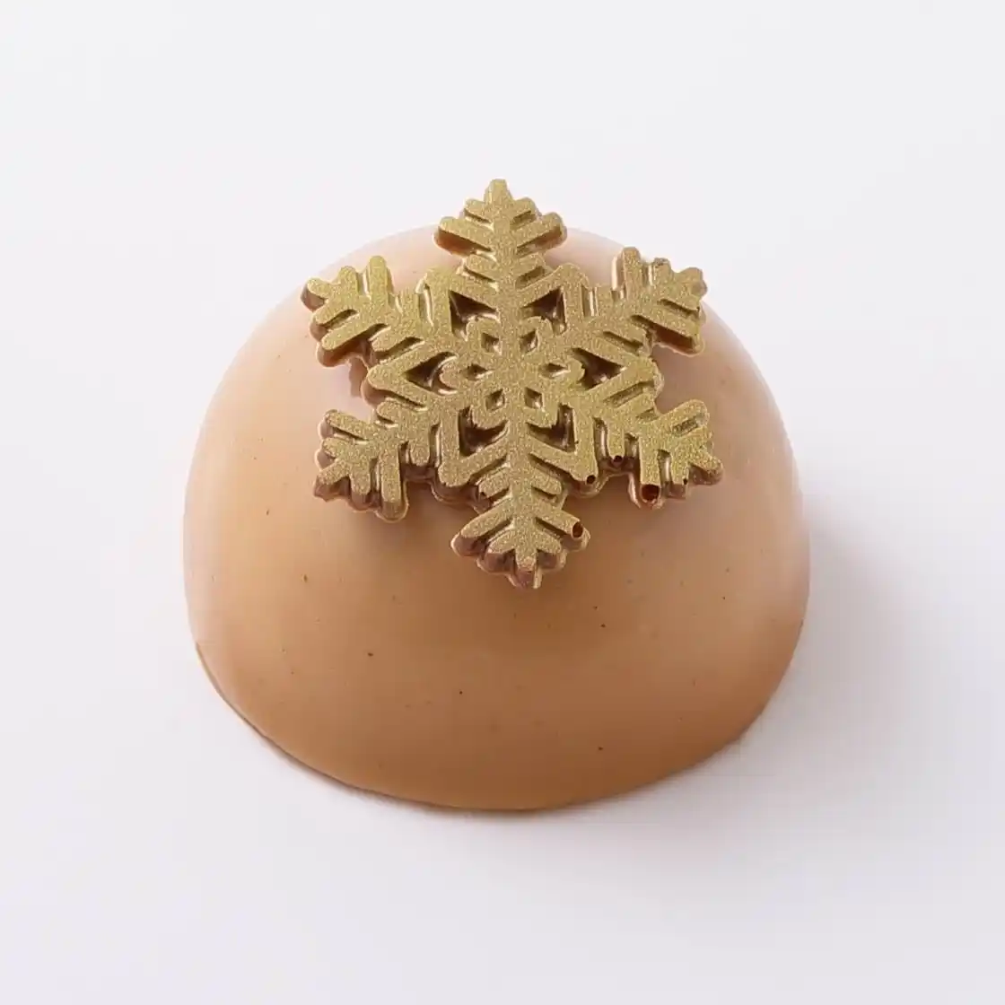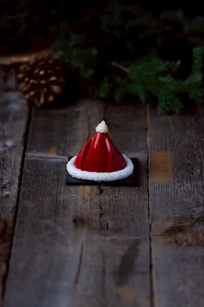 | アールグレイ風味のムースの中にイチゴ、ブラックベリー、カシスをミックスしたジュレを入れ、底にはアーモンドのスポンジとクッキ一生地を使用しています。赤色のグラサージュとクリームを絞りサンタの帽子をイメージして仕上げました。 | |||