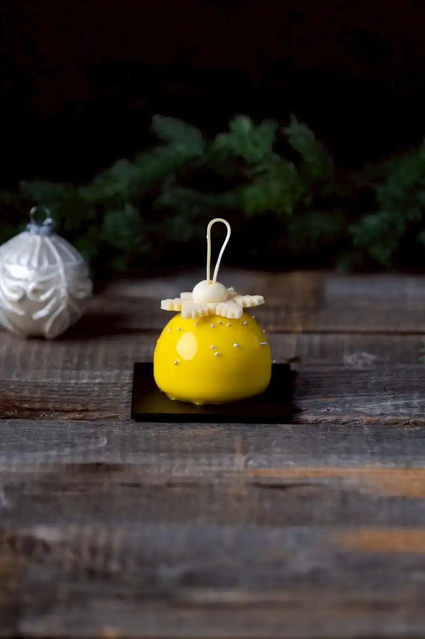 | 鮮やかなグリーンが目を惹くクリスマスツリーをかたどった可愛らしいプチガトーです。香ばしいピスタチオムースの中には甘酸っぱい苺のコンポテを閉じ込め、華やかでコクのある味わいに仕上げました。 | |||