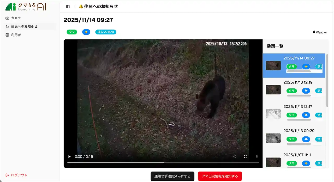 『クマミるAI』カメラで検知後、Webダッシュボードからクマ出没情報を確認 |