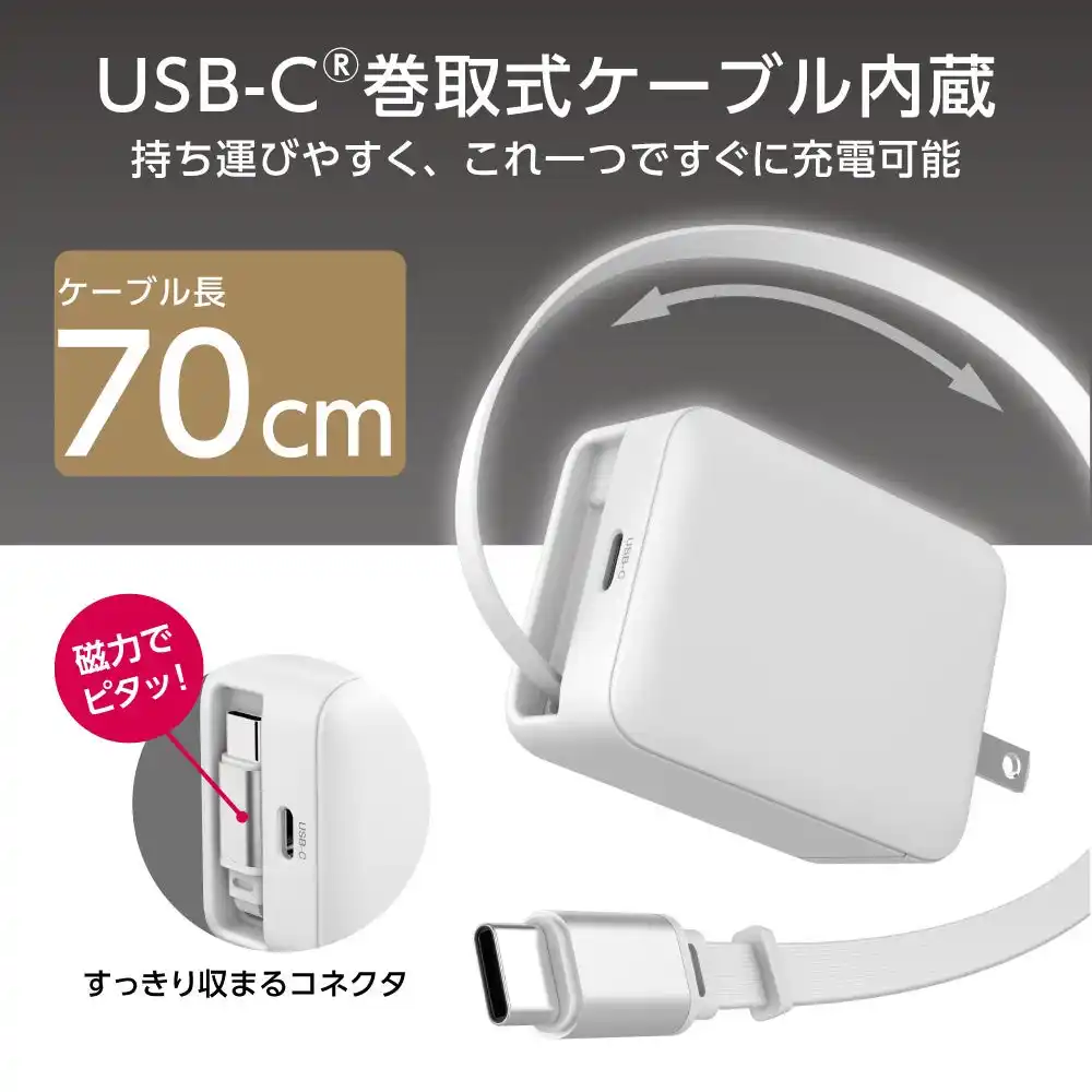| 多摩電子工業株式会社(本社:神奈川県川崎市、代表取締役 執行役員社長 杉山一)は、巻取り式USB-Cケーブル内蔵+USB-Cポート搭載、最大65WのUSB Power Delivery(PD)対応のUSB充電器(PR-APC265CK、PR-APC265CW)を、2025年12月より各ECストアにて発売開始いたしました。カラーはブラックとホワイト、価格は5,980円(税込・送料込)です。 | ||||||||||||