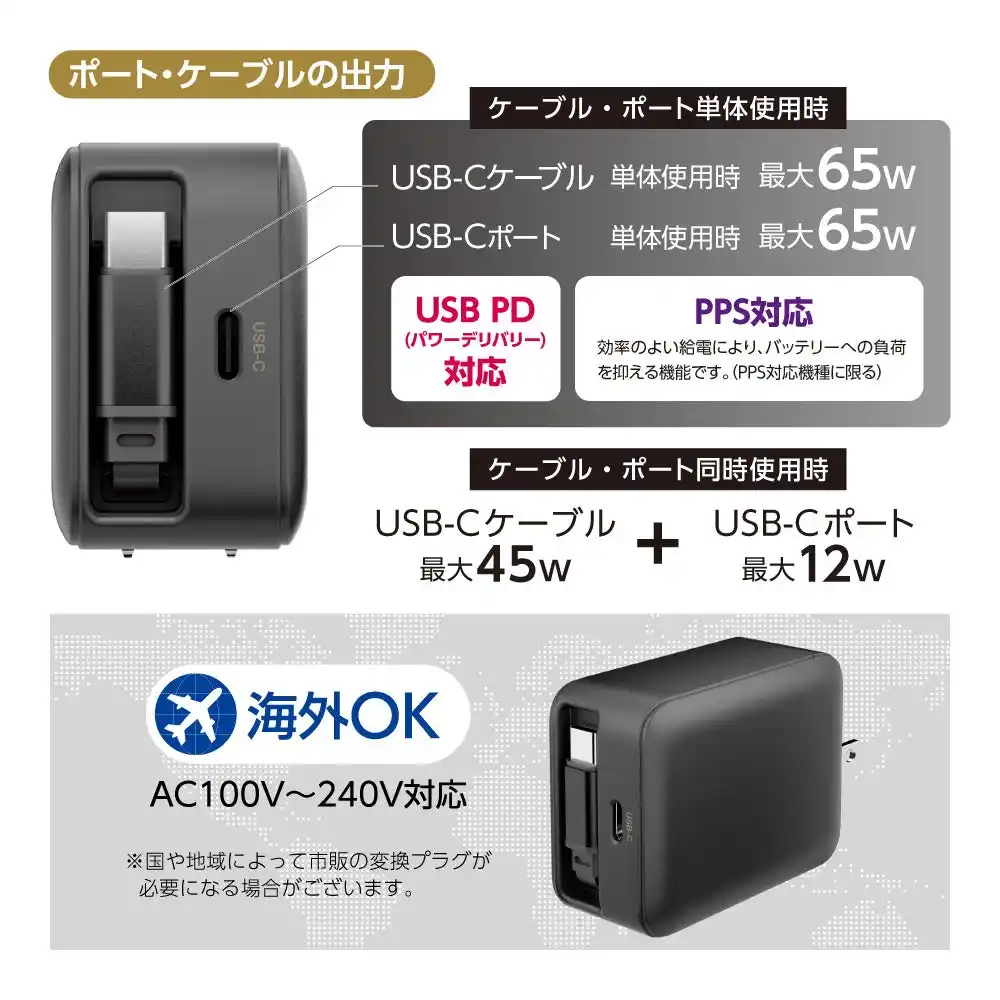 出力 :[USB-Cケーブル] 単体使用時最大65W DC5V 3A、 9V 3A、 12V 3A、 15V 3A、 20V 3.25A PPS:DC5V-21V 3.25A |