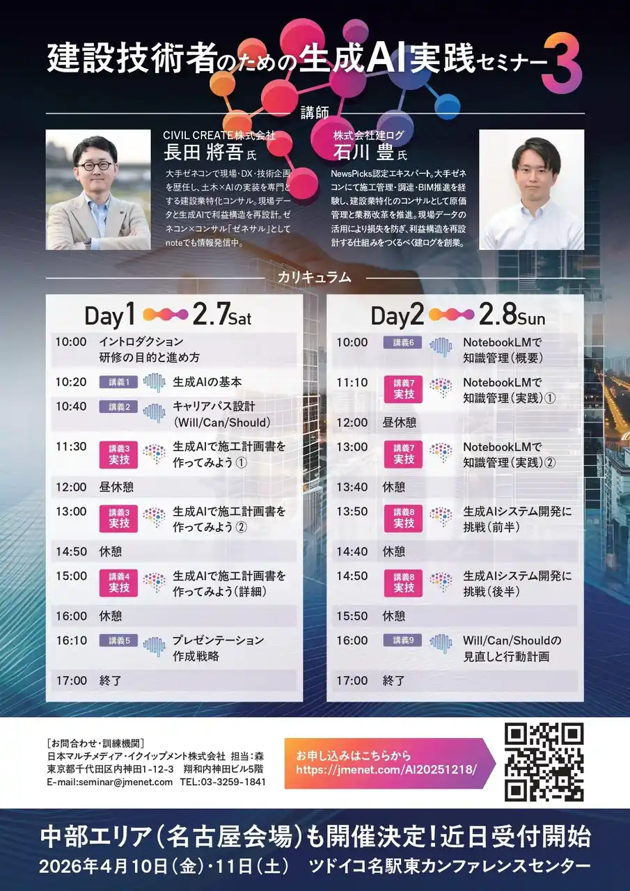 本セミナーは、CIVIL CREATE 株式会社、日本マルチメディア・イクイップメント株式会社、 株式会社新建新聞社、一般社団法人生成 AI 活用普及協会(GAIS)の 5 社共催により実施 され、現場で即活用できる生成 AI スキルを短期間で習得できる内容となっています。 |