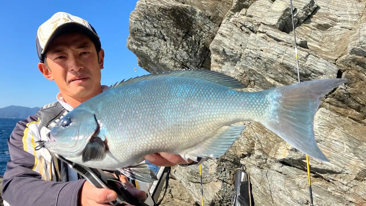 「いいグレです。真っ青でキレイ」と名手・池田も惚れ惚れとする1尾。 |