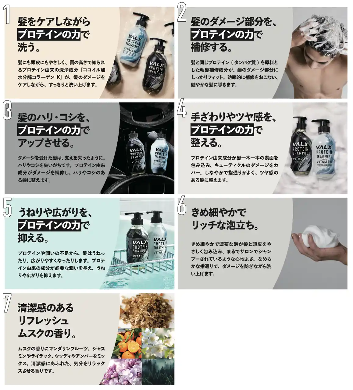 そこで、生まれたのが、プロテイン(=タンパク質)の力に着目したヘアケアアイテム。ヘア&スカルプケアの「VITALISM(バイタリズム)」と日本を代表するプロテインブランド「VALX(バルクス)」のコラボによって生まれた「VALX プロテインシャンプー&VALX プロテイントリートメント」です。 |
