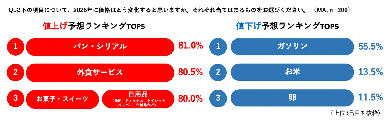 2.FPの8割以上が「2026年も値上げが続く」と予想。値上げ予想1位は「パン・シリアル」、値下げ予想1位は「ガソリン」 |