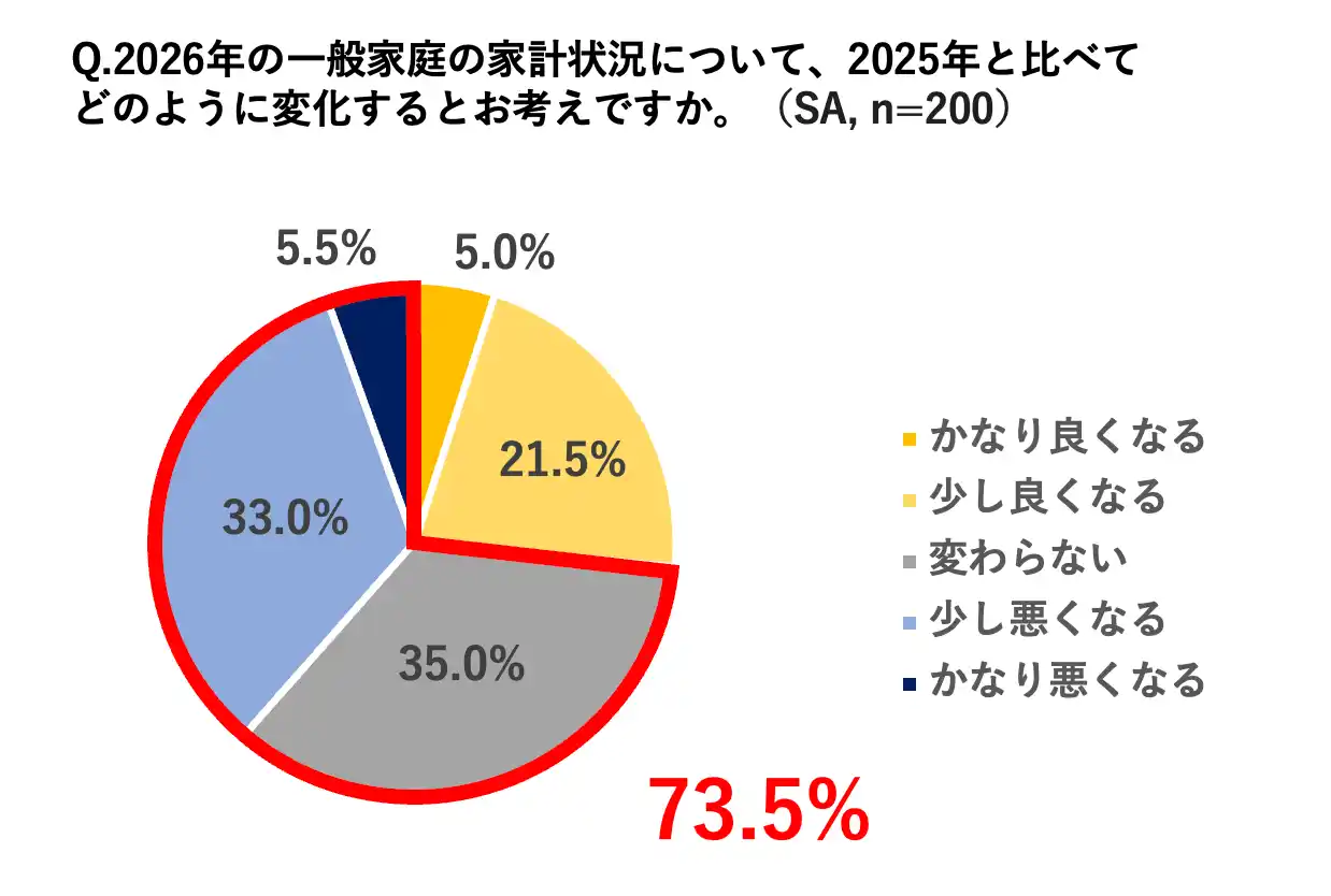 調査の結果、半数以上が2026年の世帯収入が「増加する」と回答する一方で、7割以上が家計状況は「良くならない」との見方を示し、収入の伸びを上回るペースで「値上げ(生活コスト増)」が進行し、実質的な家計の余裕は生まれないと分析していることが明らかになりました。 |