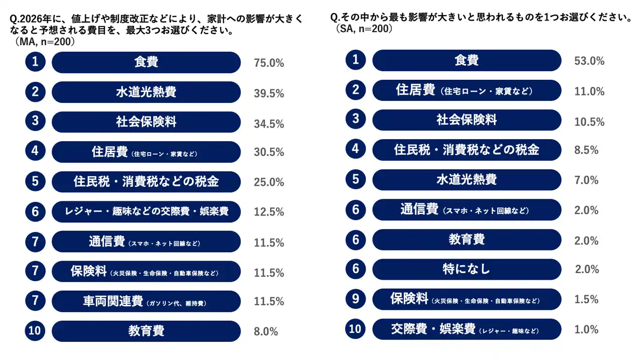 ・2026年に家計への影響が大きくなると予想される項目を聞いたところ、1位「食費(75.0%)」が突出して高い結果に。次いで2位「水道光熱費(39.5%)」、3位「社会保険料(34.5%)」が続き、生活インフラや公的負担の増加が重荷になると予想されている。 |