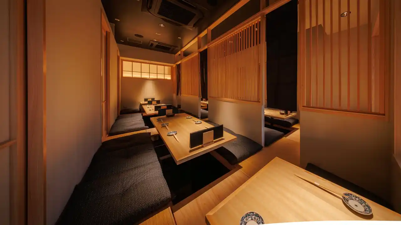 | 奥には 掘りごたつ式の座敷席(32席) をご用意。ゆったりと足を伸ばしながら、仲間やご家族とのひとときをお楽しみください。接待や会食、記念日など、さまざまなシーンに対応できる落ち着いた雰囲気です。 | |||