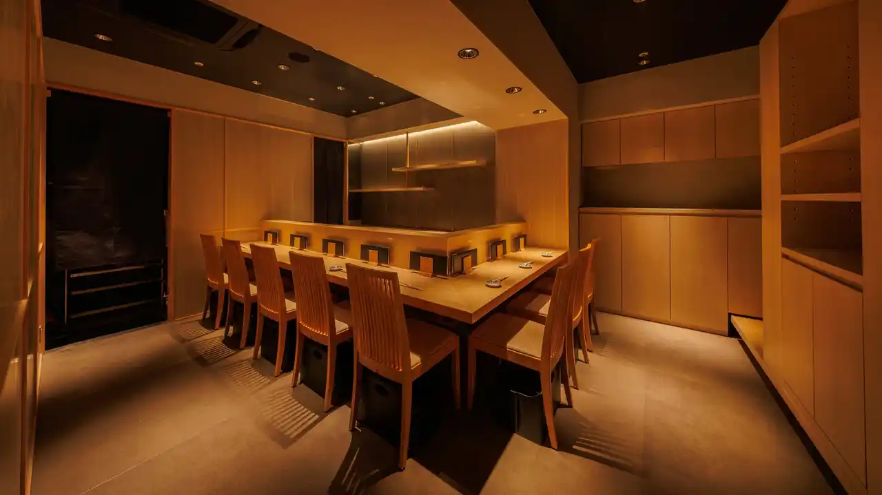 | 職人の所作を間近に感じられる カウンター席(8席) は、目の前で握られる鮨を楽しみながら、大将との会話やその日のおすすめを聞ける“特別なデート”や“一人時間”にもぴったりの特等席です。旬の魚と赤酢の香りがふわりと広がる、穏やかな時間をお過ごしいただけます。 | |||