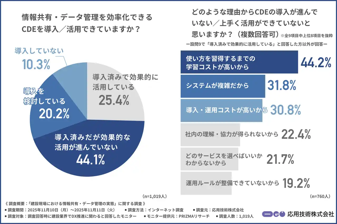 応用技術株式会社(本社:大阪市北区、代表取締役社長:船橋俊郎、以下「応用技術」)は、建設業界でDX推進に関わる方を対象に、「建設現場における情報共有・データ管理の実態」に関する調査を実施しました。 |
