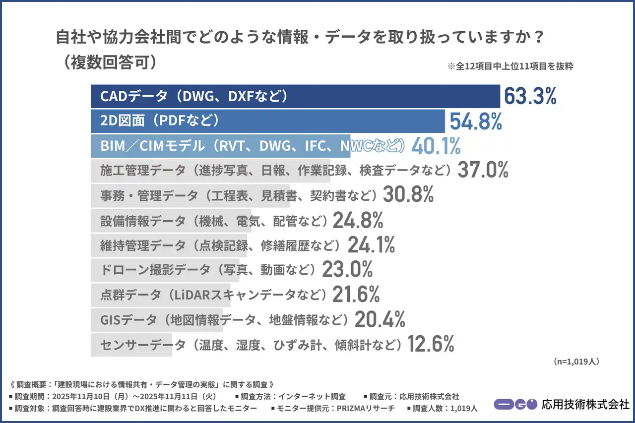 応用技術では建設業界のDX推進を支援しており、顧客課題の深堀りと解決を目的として、この度建設業界でDX推進に関わる方を対象に、「建設現場における情報共有・データ管理の実態」に関する調査を実施しました。 |