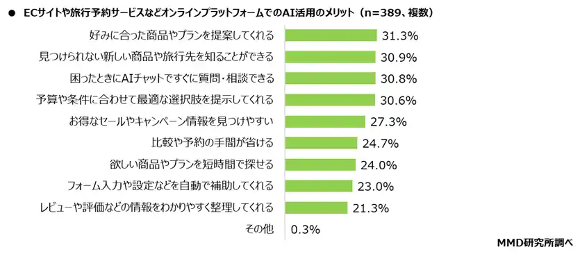 ■ ECサイトや旅行予約などオンラインプラットフォームでのAI活用のメリットは「自分の好みに合った商品やプランを提案してくれる」「自分では見つけられない新しい商品や旅行先を知ることができる」「困ったときにAIチャットですぐに質問・相談できる」 |