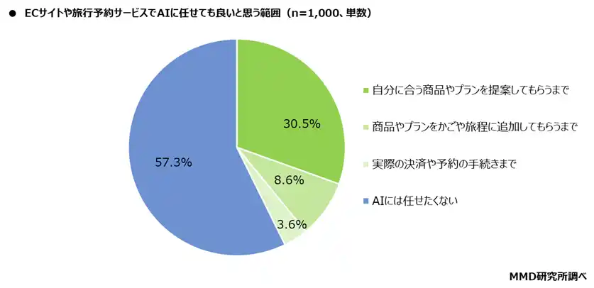 18歳~69歳の男女1,000人を対象に、ECサイトや旅行予約サービスでAIに任せても良いと思う範囲があるか聞いたところ、「自分に合う商品やプランを提案してもらうまで」が30.5%、「商品やプランをかごや旅程に追加してもらうまで」が8.6%、「実際の決済や予約の手続きまで」が3.6%、合わせてAIに任せてもいい範囲がある人は42.7%となった。 |