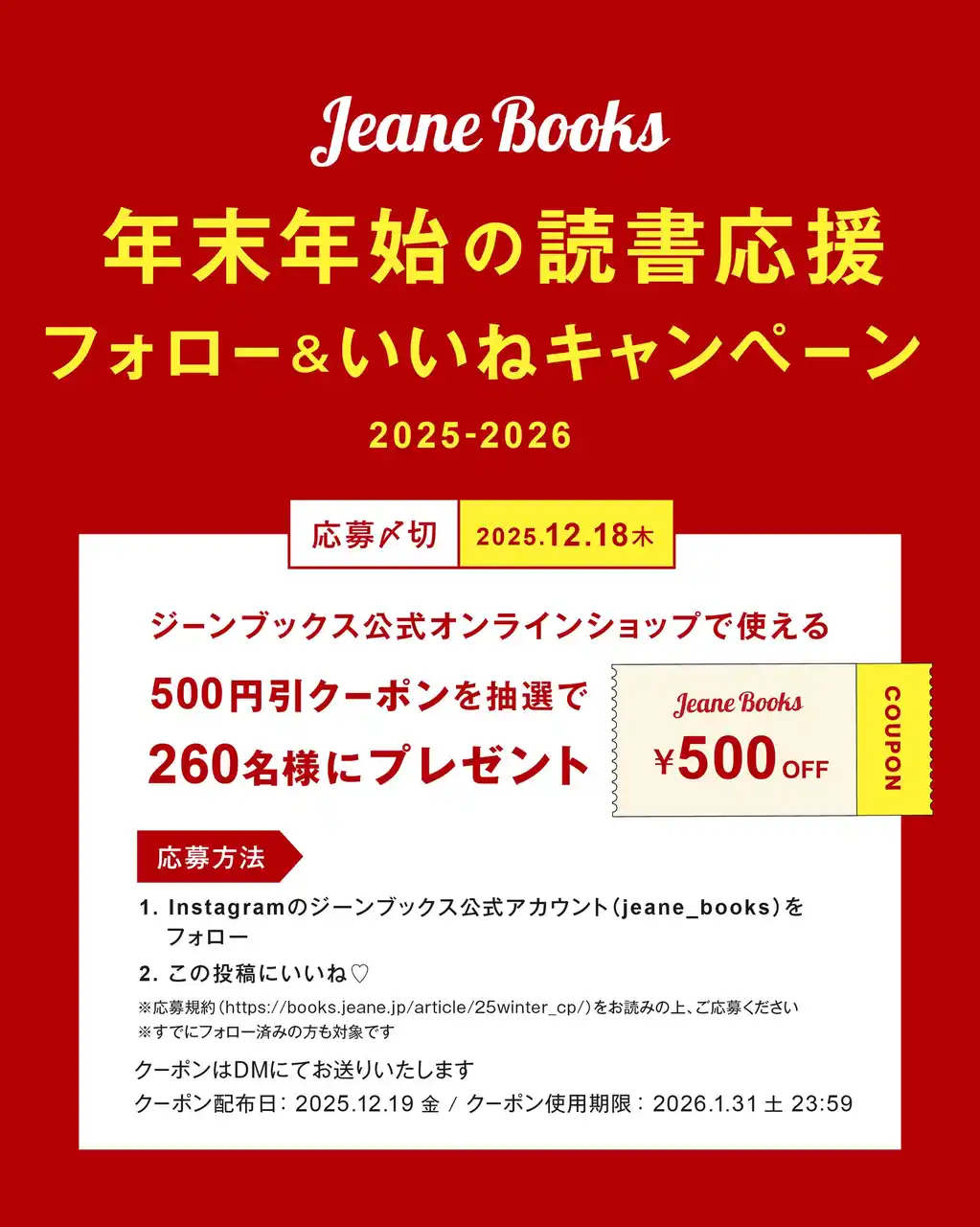 Jeane Books 年末年始の読書応援キャンペーン (Instagram版表記「Jeane Books 年末年始の読書応援フォロー&いいねキャンペーン」) (X版表記「Jeane Books 年末年始の読書応援フォロー&リポストキャンペーン」) |