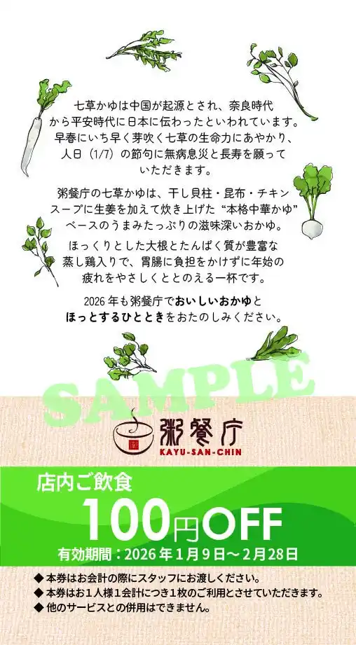 ■七草の日は粥餐庁へ!次回以降使えるお得なクーポン付き |