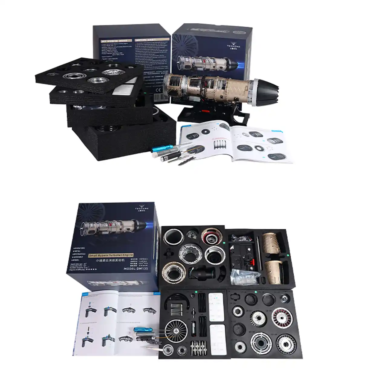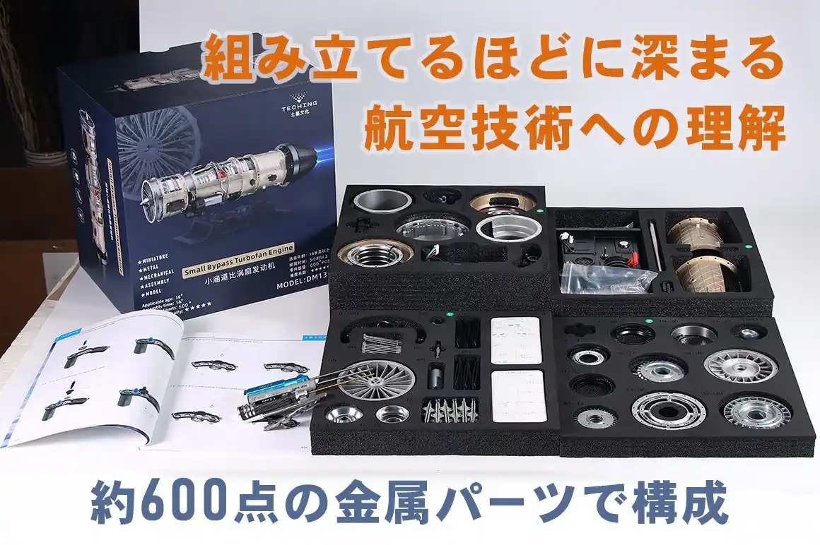 材質:アルミニウム合金 + ステンレススチール モデル:スモールバイパスターボファンエンジン モデル寸法:450mm126mm197mm パーツ数:600個以上(ネジナット類含) 駆動方式:モーター駆動 バッテリー:3.7V 800mAh リチウムバッテリー 電源充電ケーブル:DC 5V USBケーブル 充電時間:3時間 バッテリー駆動時間:1時間(フル充電時) 組み立て時間:目安として5時間以上 製品重量:約 4.3kg パッケージ重量: 約6.58kg |