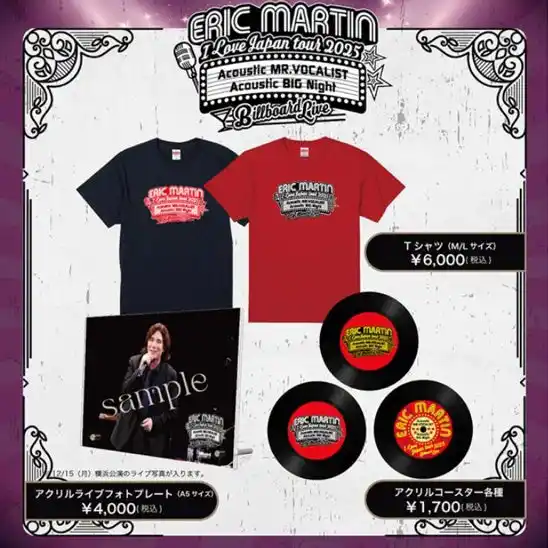| 株式会社阪神コンテンツリンクでは、2025年12月に開催されるエリック・マーティンのビルボードライブ公演『Eric Martin I Love Japan tour 2025』の限定オリジナルグッズを、公演に先駆けて2025年12月10日(水)12:00より、オンラインショップ【Shop.Merchan.jp(ショップ・マーチャンドットジェイピー)】にて販売いたします(公演当日は会場でも数量限定で販売予定)。 | |||||||||||||||