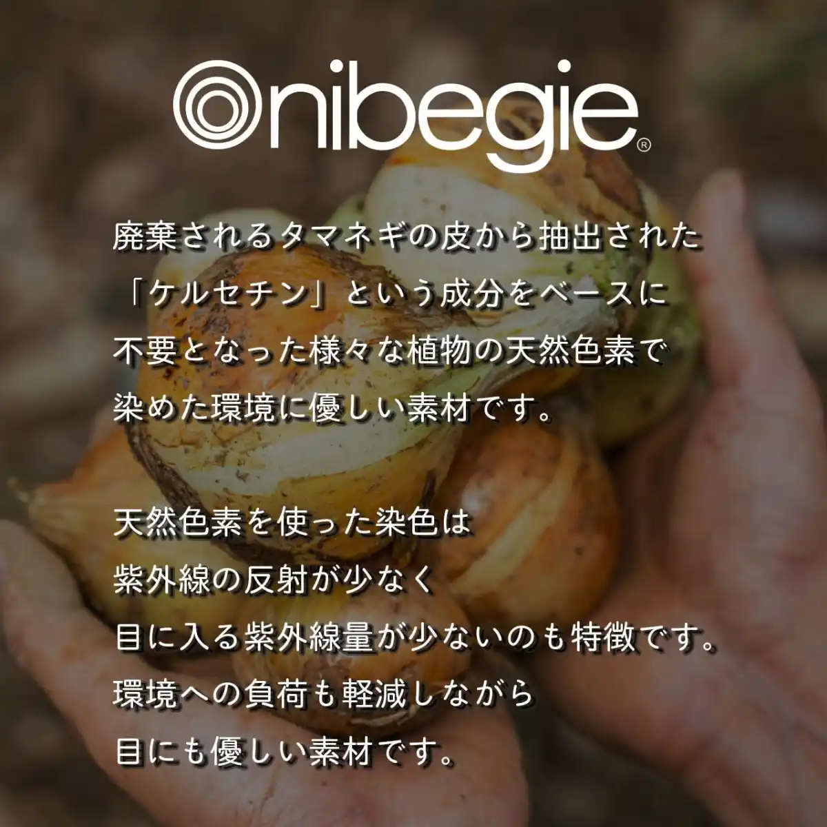 廃棄される国産タマネギの皮から抽出した天然成分をベースに、不要となった様々な植物の天然色素を組み合わせて生地を染色。捨てるものを再利用することで廃棄物を減らし、天然色素を使用することで環境への負荷も軽減しています。天然色素で染めた生地は明度が下がり、目に入る紫外線も減少させるという優れた機能も持ち、目に優しい素材です。
