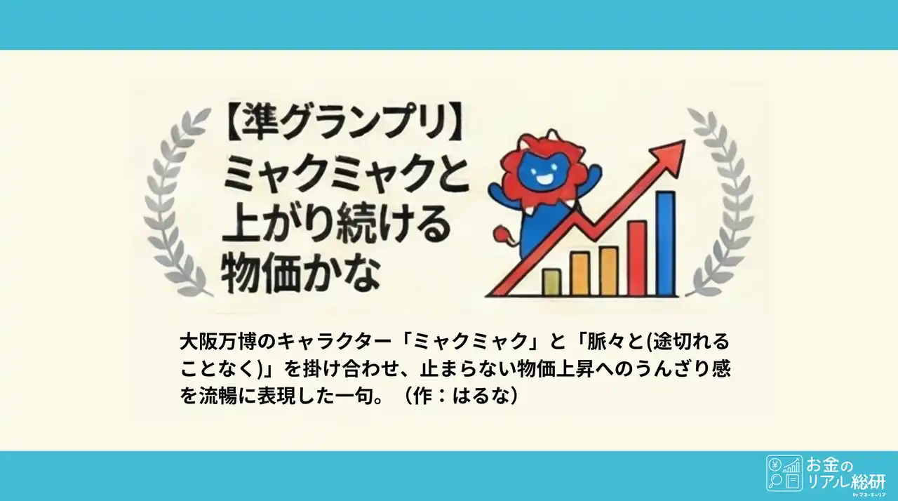 | 11月5日~11月31日の応募期間で4,472件の作品が寄せられました。物価高や将来不安、家計のやりくり、副業や投資の迷いなど、この一年の“お金のモヤモヤ”が五・七・五に込められています。 | |||