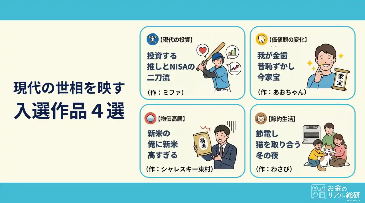 | 日々の生活の中で感じる“お金にまつわる本音”を、五・七・五の川柳形式で自由に表現してもらう一般参加型の投稿キャンペーンです。物価高や将来への不安、家計のやりくり、副業・投資の悩みなど、生活者が抱えるリアルな思いや気づきを、ユーモアを交えて可視化することを目的としています。応募された川柳からは、世代ごとの価値観や時代背景が垣間見え、社会の“今”を映し出す声が集まります。 | |||