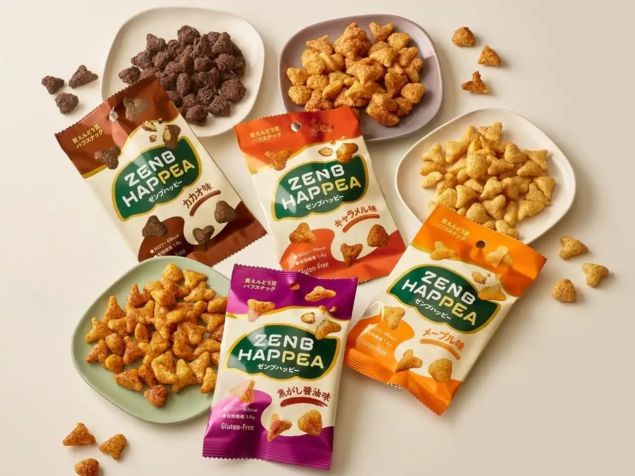 | 商品名の「HAPPEA(ハッピー)」には、いつでも気兼ねなくおやつを食べられる“幸せ(HAPPY)”と、“黄えんどう豆(YELLOW PEA)”からできた新しいおやつという意味を込めています。 | ||||||||||||||