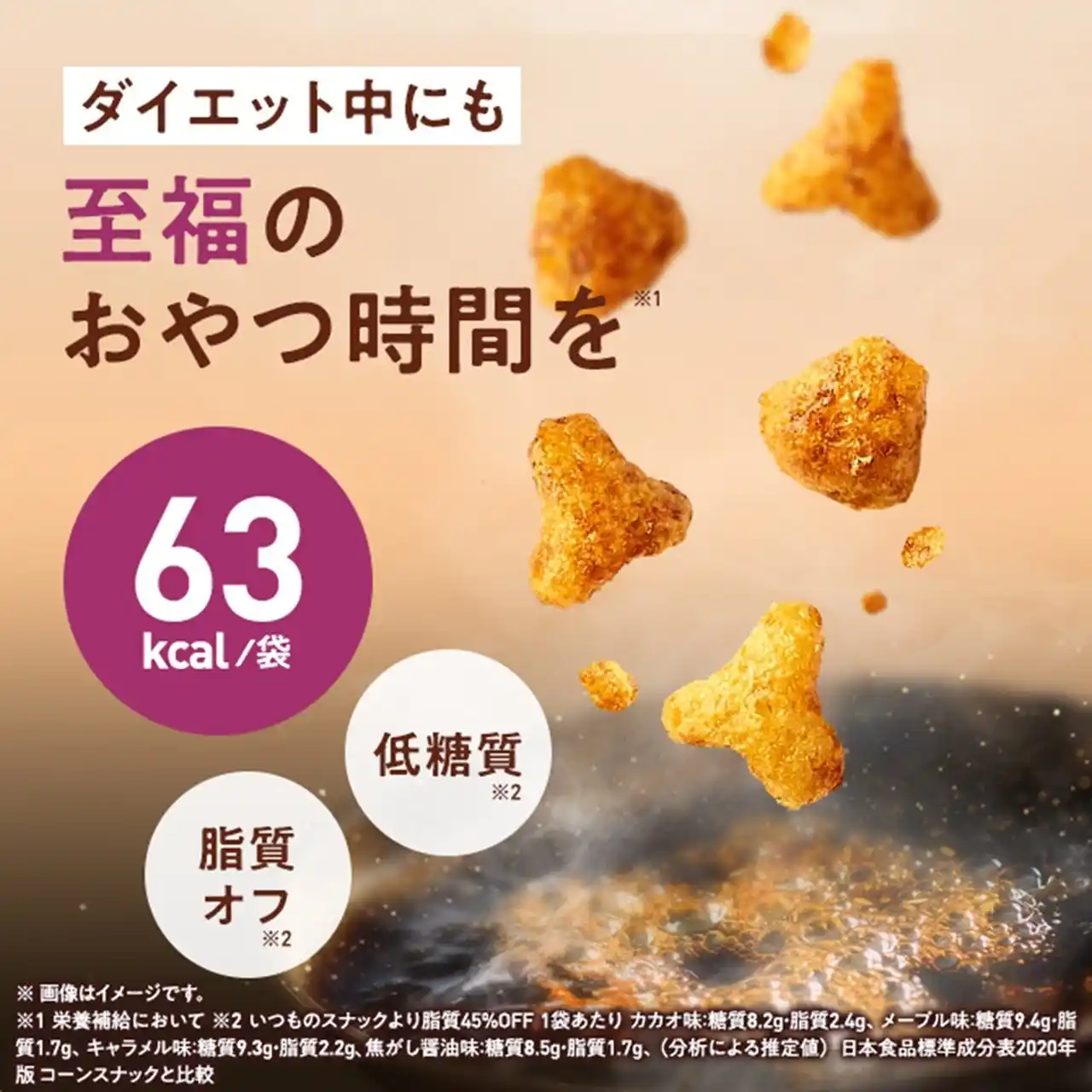 | ダイエット中でもおいしいおやつ時間を※1!63kcal・低糖質・脂質61%オフ※2。 |
