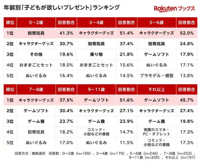 現在子育て中の「楽天ブックス」ユーザーに、「今年のクリスマスに子どもへプレゼントを贈る予定があるか」を聞いたところ、9割以上のユーザーが「はい」と回答しました。また、「子どもがクリスマスプレゼントに欲しがっている、または普段の様子から欲しがっているおもちゃのジャンル」を年齢別で聞いたところ、0~2歳では「知育玩具」、3~8歳では「キャラクターグッズ」、9歳以上では「ゲームソフト」がそれぞれ1位という結果になりました。 |