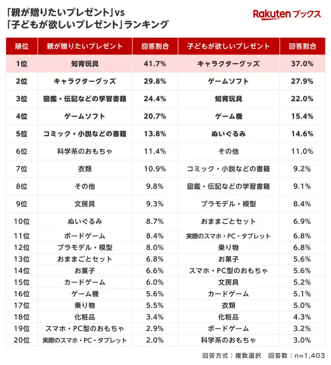・「親が贈りたいプレゼント」1位は「知育玩具」。一方で「子どもが欲しいプレゼント」1位は「キャラクターグッズ」。特に「ゲーム機」では、親子で順位に大きな違いも |