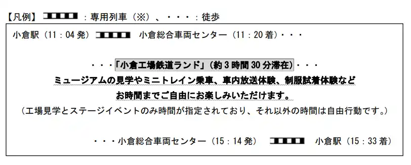 | (1)鉄道ランド行きツアー専用列車で、小倉工場鉄道ランドへ直接乗り入れを体験! 列車に乗ったまま、小倉総合車両センターへ入場します。 | |||||||||