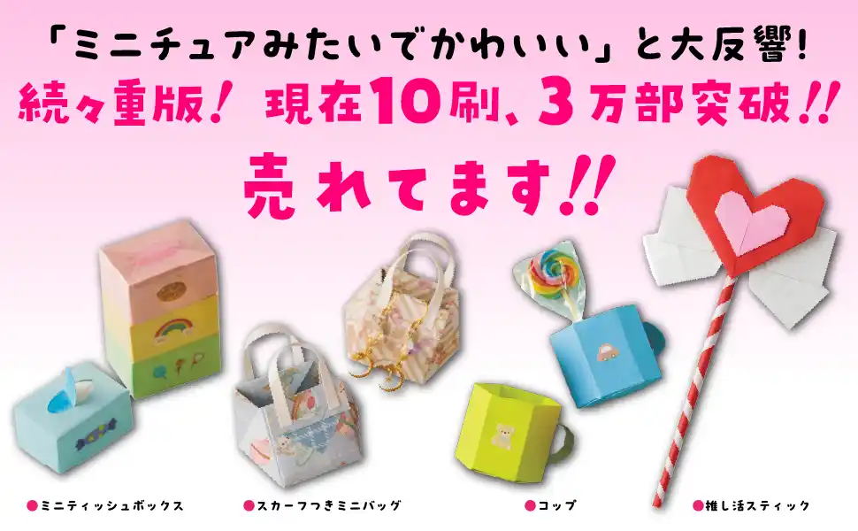 株式会社飛鳥新社(本社:東京都千代田区、代表取締役社長:土井尚久)より、2024年8月2日に発売となりました書籍『大人も子どももキュンとする オルキルラボの 小さくてかわいいおりがみBOOK』(オルキルラボクラフト著)の10刷重版が決定し、累計3万部となりました。 |