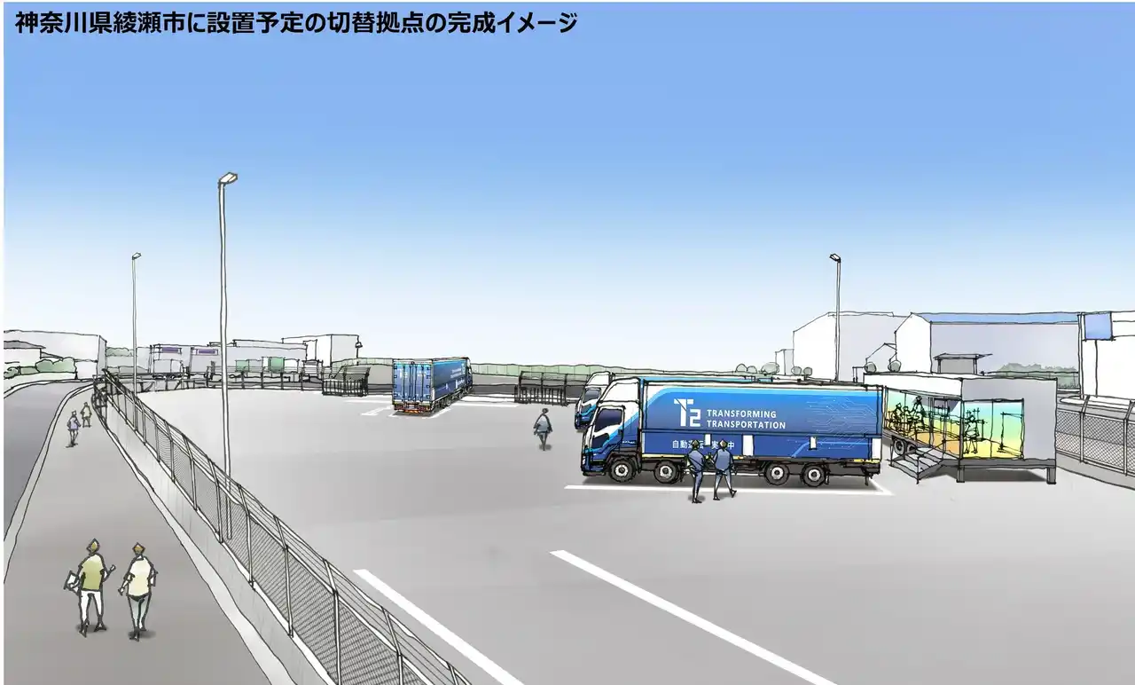 2025年11月に着工し、2026年2月に本拠点の完成を目指します。T2が国内の物流事業者として初めて*⁴設ける予定の神奈川県綾瀬市の「切替拠点」とあわせて、自動運転トラックによる関東ー関西間の幹線輸送体制の確立を図ります。 |