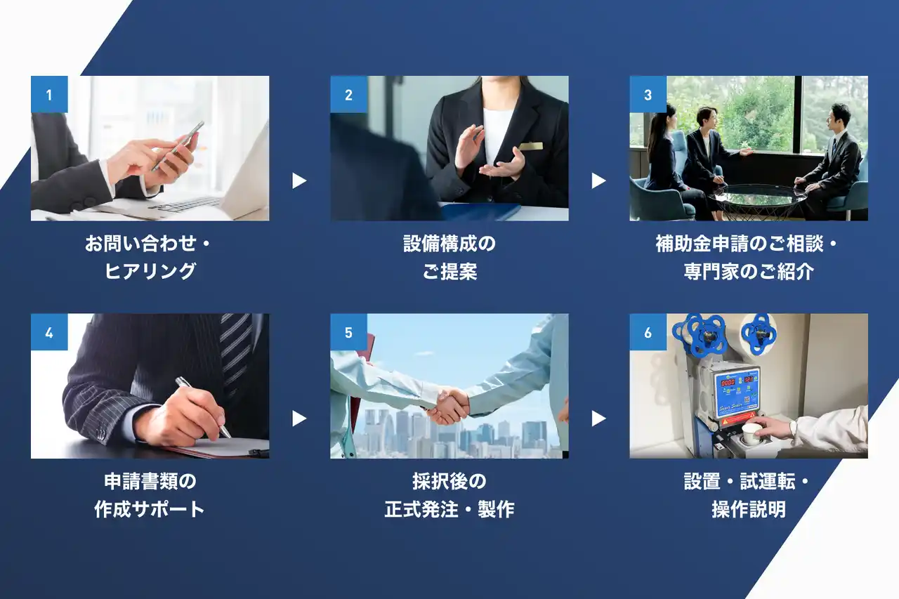 数百万円規模の設備投資となるロータリーシール機などについて、創業50年の知見と補助金申請の専門家と協業し、設備選定から事業計画策定、申請、採択後の導入・立ち上げまでをワンストップで支援いたします。 |