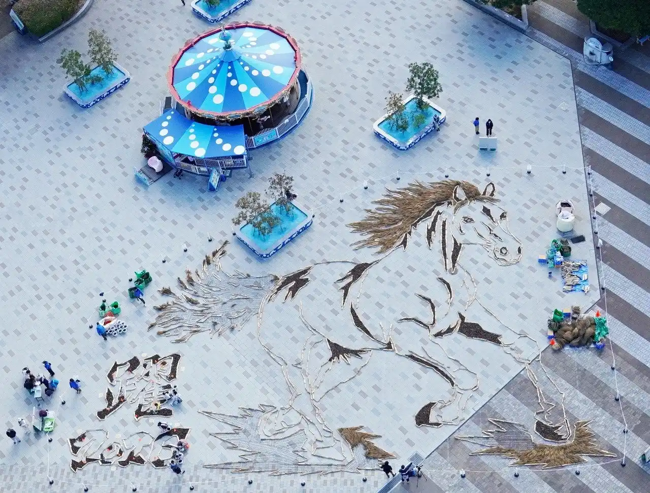 | 「干支の巨大地上絵」は、冬の新たな魅力づくりのため2008年度から始まり、今年で17作品目となります。巨大地上絵は、縦:23m×横:34mほどの大きさです。輪郭には薪を配置し、たてがみやしっぽには刈り取り後のコキア約600本、脚には約7,500個の松ぼっくりを敷き詰め、園内で採れた自然素材を材料に、迫力ある馬の姿を表現します。 | |||||||||||||||||||