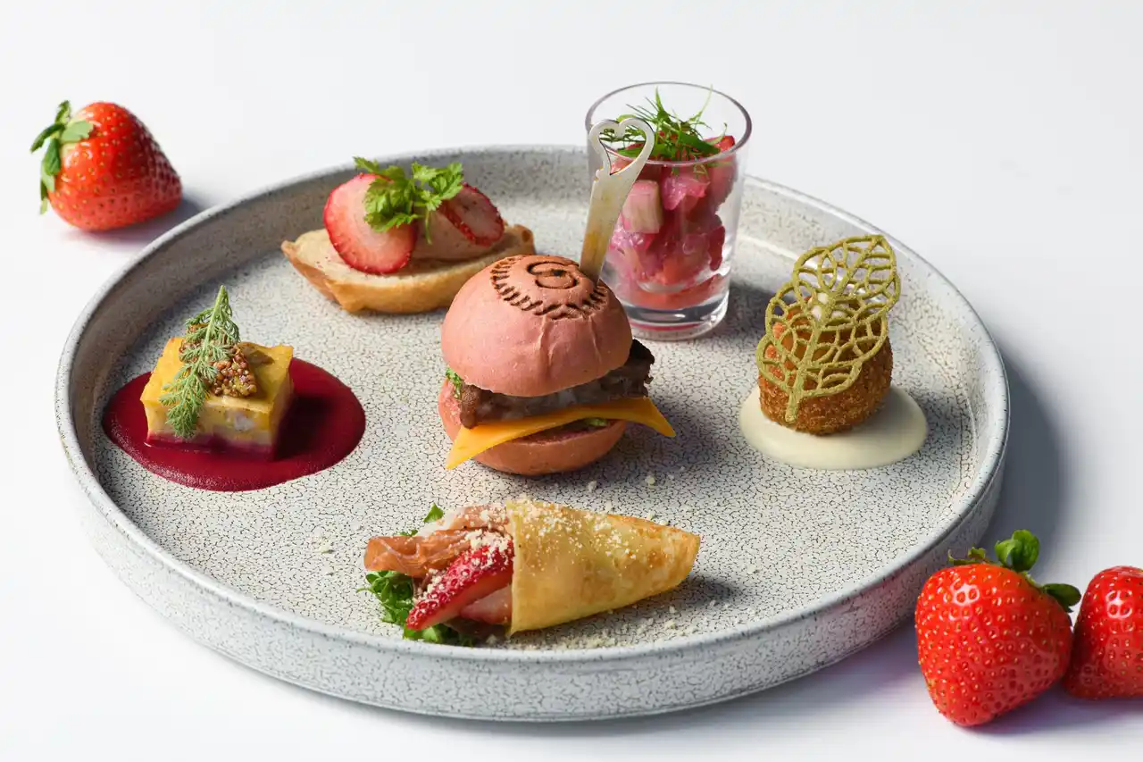 | 苺とフォアグラのムース / 桜島美湯豚と野菜のスペイン風オムレツ / 鹿児島県産白身魚のマリネ、苺ドレッシング / ハモンセラーノと苺のクレープ包み / 鹿児島県産黒毛和牛パティのスライダー / ベーコンとほうれん草のクリームコロッケ | |||||||||