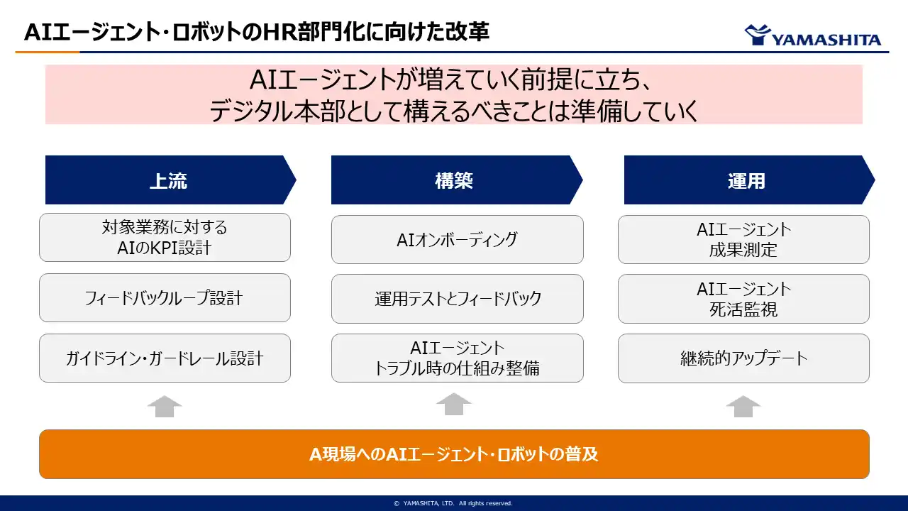 ヤマシタは、AIを社員のように扱うデジタル部門の「AIエージェントHR構想」を推進します。AIごとに役割・KPI・安全基準・権限範囲を設定し、導入から改善までを一気通貫で管理。将来的にはロボットも同一フレームで統合し、人・AI・ロボティクスが協働する組織モデルの実現を目指します。 |