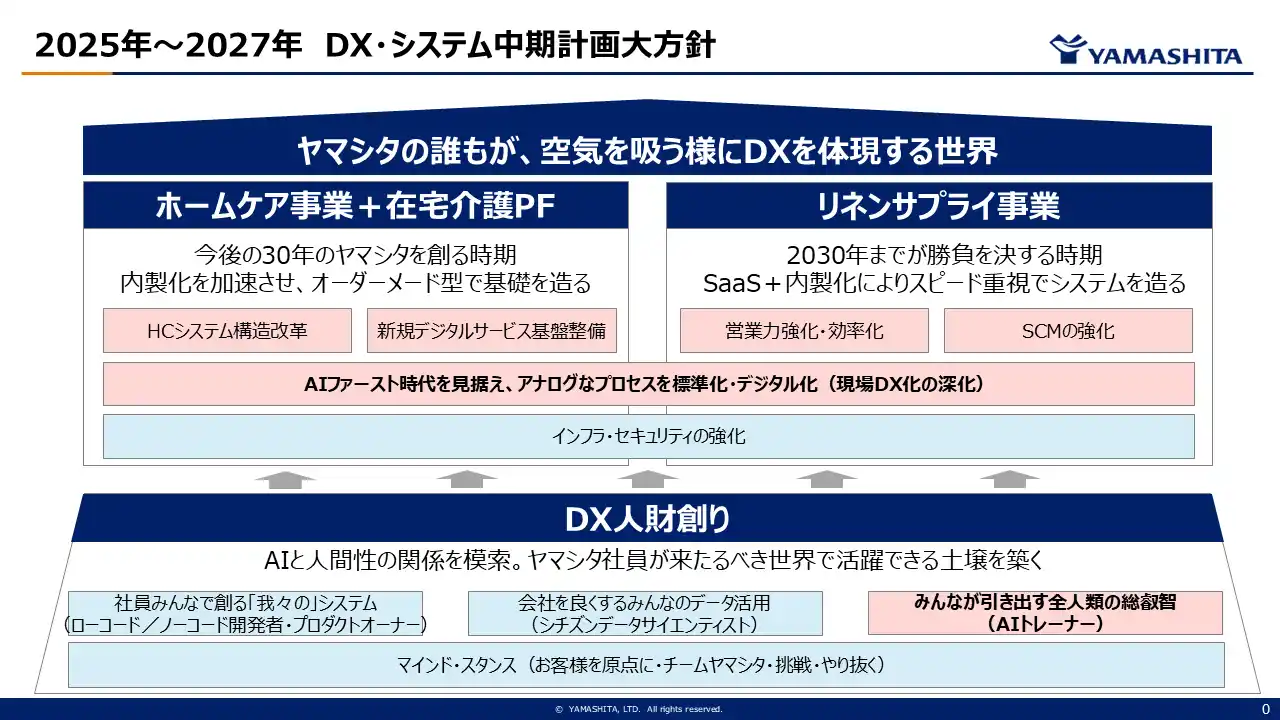 介護用品(福祉用具)レンタル・販売およびリネンサプライ事業を行う株式会社ヤマシタ(本社:静岡県島田市、代表取締役社長:山下和洋、以下「ヤマシタ」)は、AIを前提とした新たなデジタル戦略「AIファーストDX方針(2025-2027)」を始動しました。テーマは、「労働集約だからこそAIで人の価値を最大化する」。MCPを軸とした基幹システム新アーキテクチャと、AIを社員のように育成・管理する「AIエージェントHR構想」により、3,000名規模の現場起点で高生産性モデルを構築します。 |