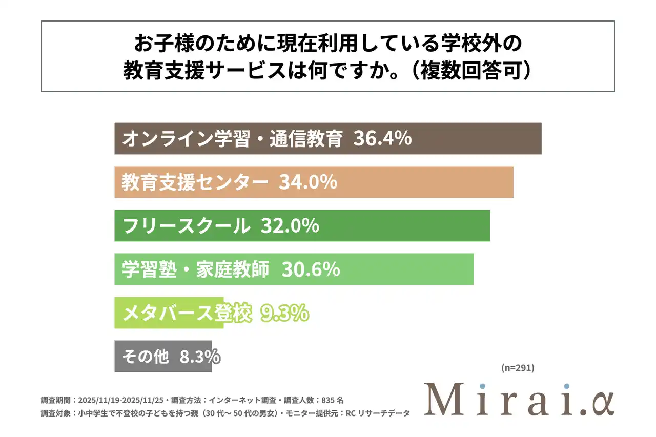 今回の調査により、小中学生で不登校の子どもを持つ親の約35%が、不登校の子どものために何らかの学校外の教育支援サービスを利用しており、こうした人の最も多くが、不登校の子どものために現在利用している学校外の教育支援サービスは「オンライン学習・通信教育」であることが明らかになりました。