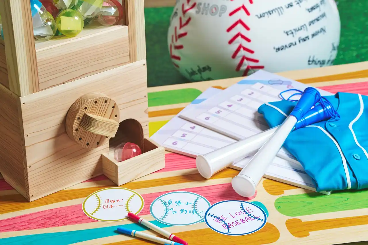 野球場をイメージしたスタジアムルームは、バットを使用した三脚テーブル、野球ボール型のクッション、電光掲示板を模した壁面、ジェット風船の装飾など、空間全体が野球をテーマにしたデザイン。宿泊者限定で、誰でも自由に利用できます。 |