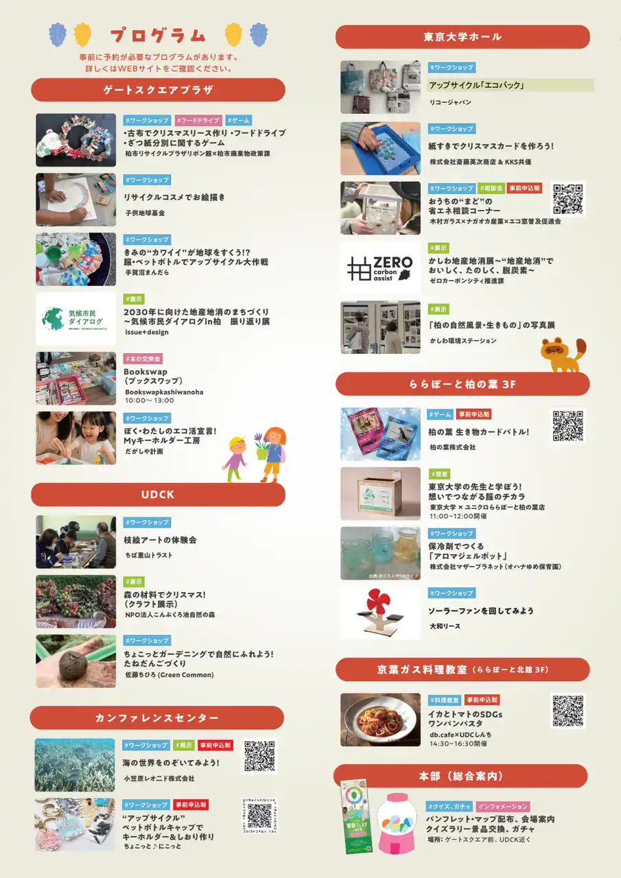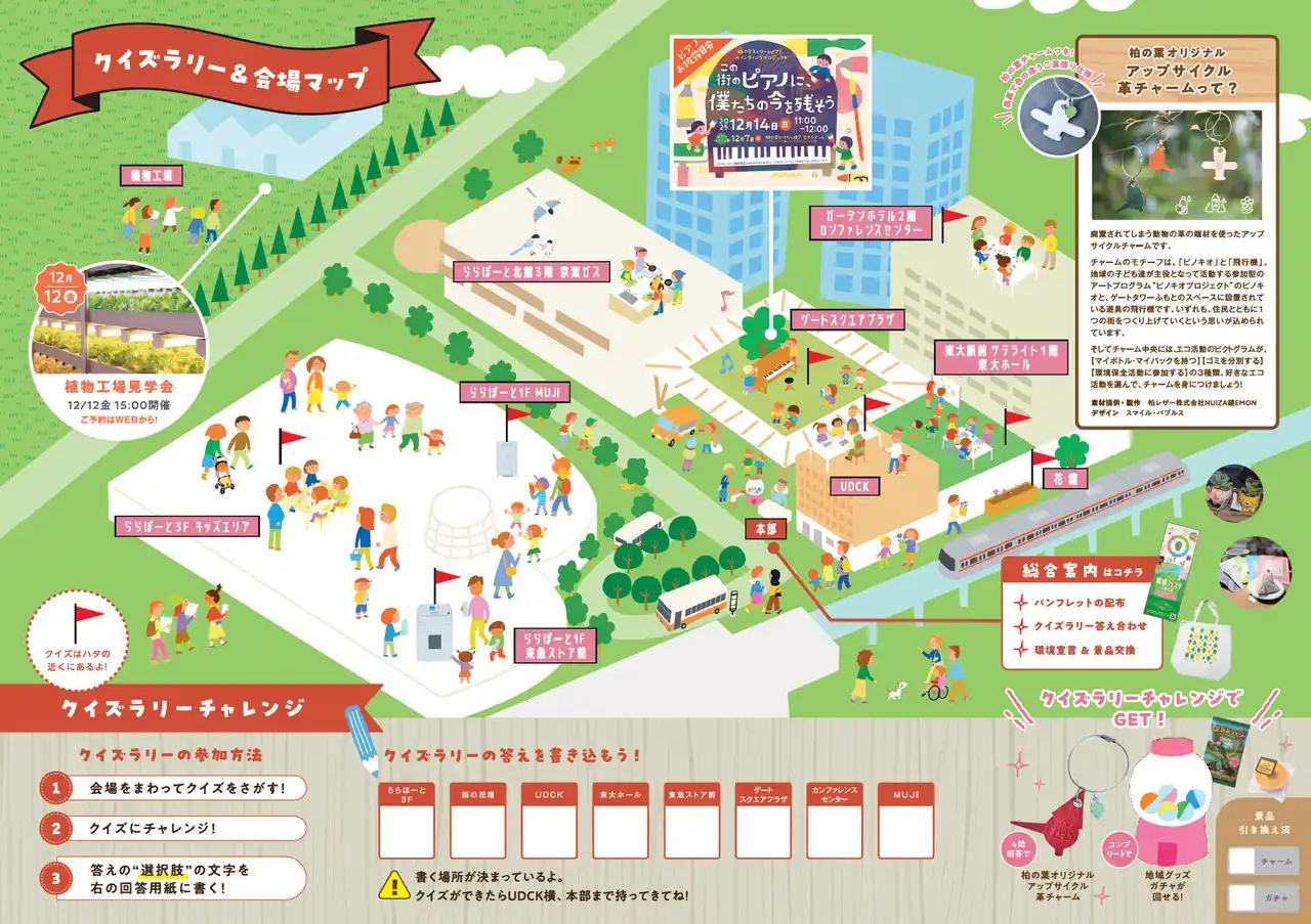 UDCK(柏の葉アーバンデザインセンター:Urban Design Center Kashiwa-no-ha)及び柏市環境部は、「みんなが変われば、地球も変わる!」をテーマとする環境タウンイベント『かしわ環境フェスタin柏の葉』を、12月14日(日) 10時から16時まで、柏の葉キャンパス駅周辺エリアで開催します。(一部、事前申込制) |