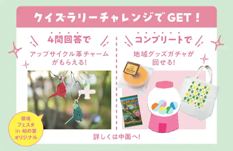 このクイズラリーにチャレンジした後に、環境に関する宣言をすることで、革製品制作時の端材を活用したオリジナルのアップサイクル革チャームや、様々な地域グッズがもらえるプレゼント企画を実施します。 |