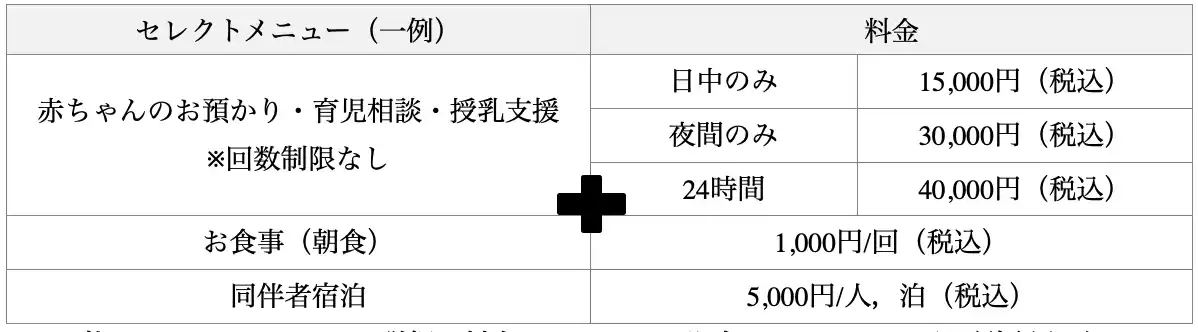 ホテル宿泊や育児相談、授乳支援といった基本的なプランに加え、3つの託児プランや食事等のオプションを自由に選択することで、利用者が自身の予算や必要なサービスに合わせてカスタマイズが可能です。予約や利用のハードルを下げ、より身近で使いやすい産後ケアを提供いたします。 |