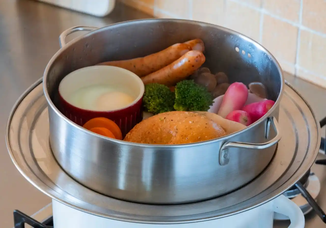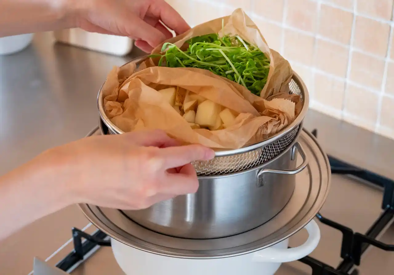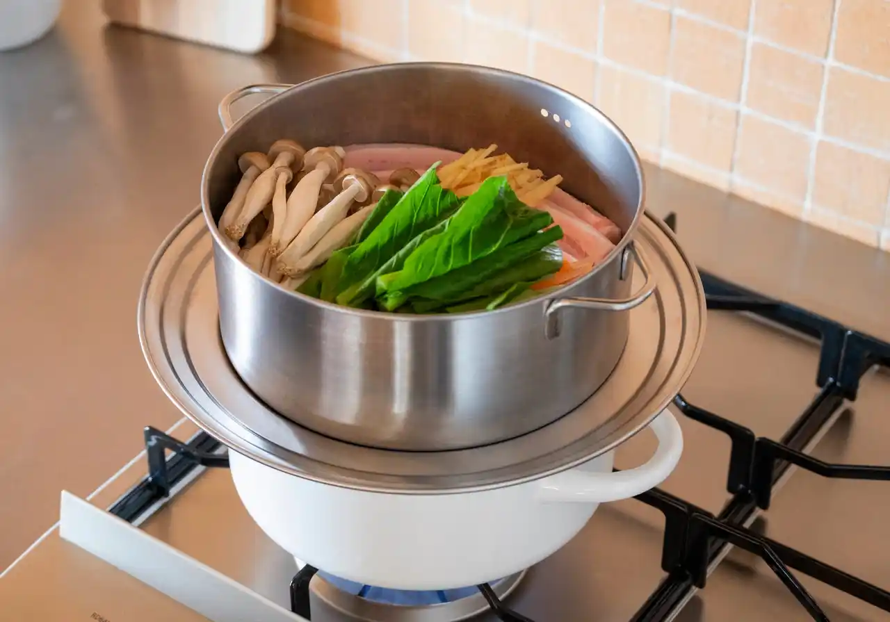 | また、蒸しに使った水には食材のうま味がたっぷり凝縮されています。そのままスープやお味噌汁に活用すれば、栄養も風味も逃さずもう一品が完成。「調理しながら次の料理のベースができる」という効率の良さも、毎日の食卓に嬉しいポイントです。 | ||||||||||||||