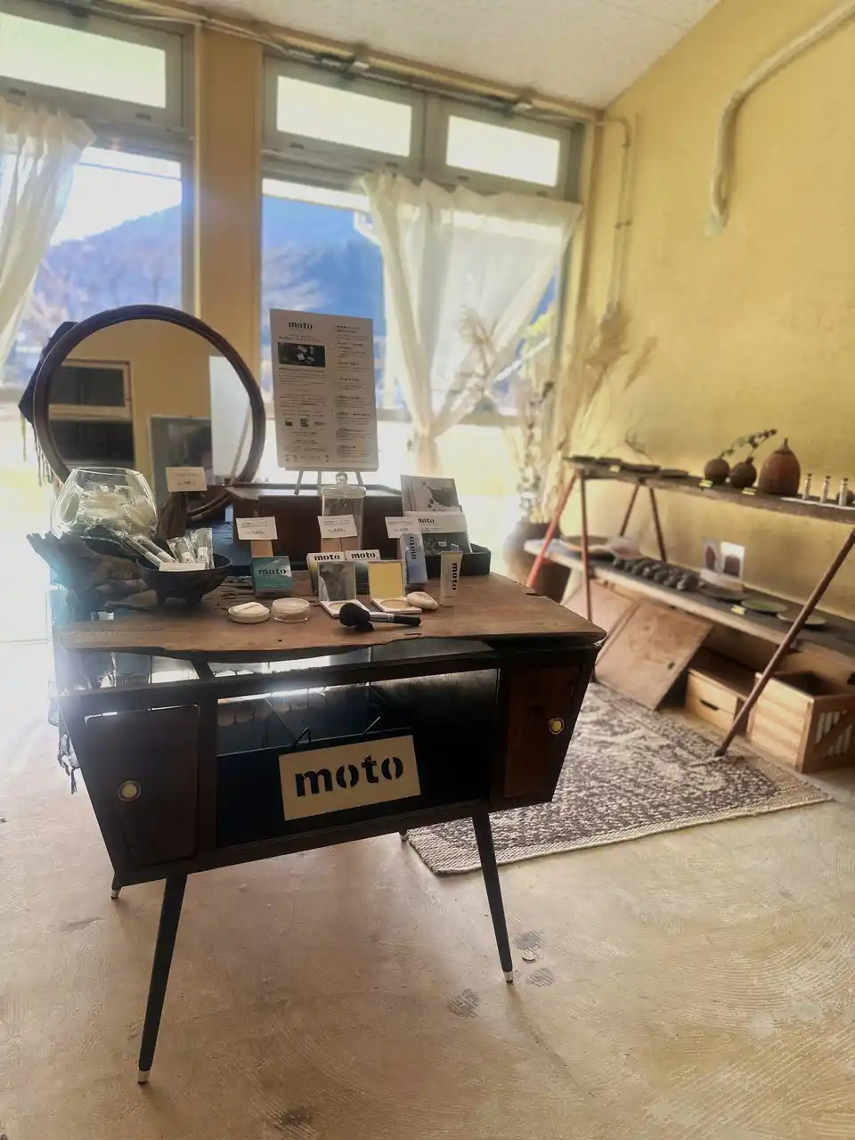 今回の移転に合わせ、同施設内にショップ「もと」を新規オープン。 東栄町で採れる鉱物・セリサイトを使った化粧品ブランド「moto(モト)」の製品に加え、町の特産品や、町在住の陶芸作家・山本幸嗣氏の作品など、地域の魅力を伝える品々を取り揃えています。 観光客にも町民にも開かれた「東栄町の魅力を持ち帰れる店」として展開していきます。 |