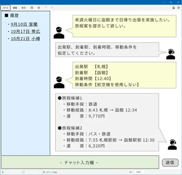 申請者がAIエージェントに対して、出張日や出発地・到着地、その他各種条件を対話形式で問い合せすることにより、旅程候補を提示します。 |