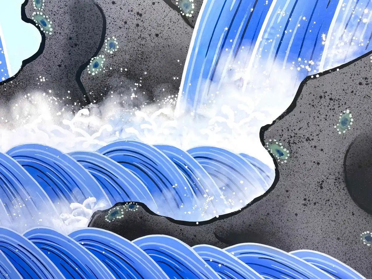 轟音とともに流れ落ちる水流と、飛沫が生み出す生命力に満ちた風景・・・2階から3階の階段室に広がるこの滝の絵は、歌舞伎『日本振袖始』の背景画を高さ6メートルの圧倒的なスケールで再構成したものです。この滝の姿は、その多種多様なエネルギーを象徴しています。 |