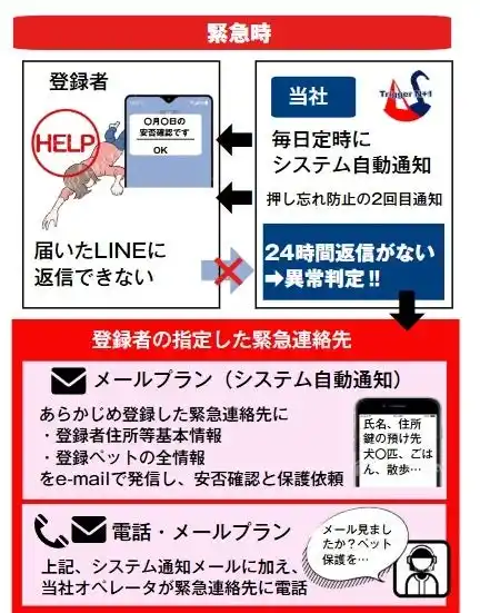 メールプラン、電話・メールプラン、団体契約プランの3種類があります。LINE通知に24時間「OK」反応が無い場合、どのプランでも、緊急連絡先に、飼い主情報、飼い主が登録したペットに関する情報一式が自動的にメール発信されます。 |