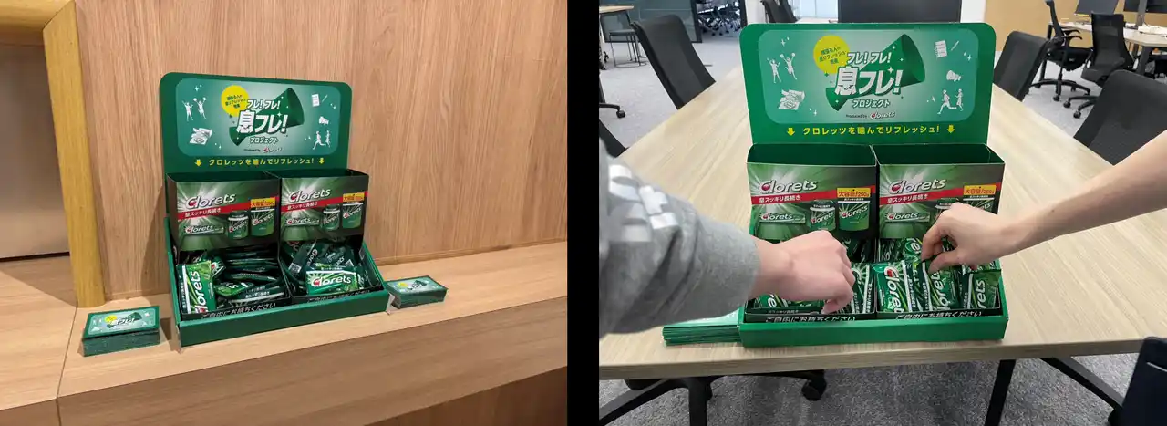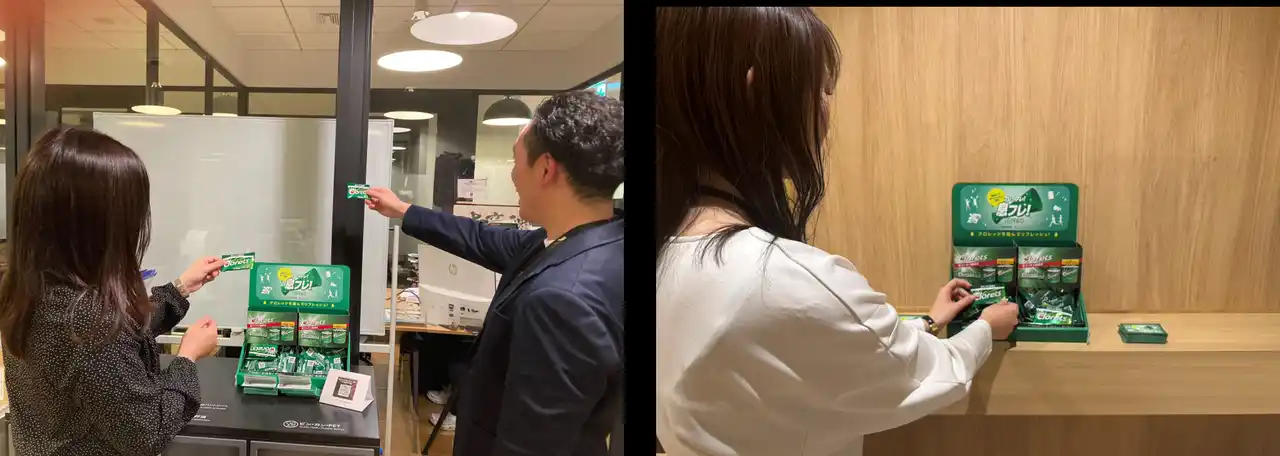 本プロジェクトの取り組みの一つとして、社員の生産性向上や健康経営を目指す企業3社に、 オフィスやワークスペースでのクロレッツのサンプリングを実施しました。その結果、多くの方から、業務の合間にガムを噛むことを取り入れることで、リフレッシュや気分転換のきっかけになったという声をいただきました。 |