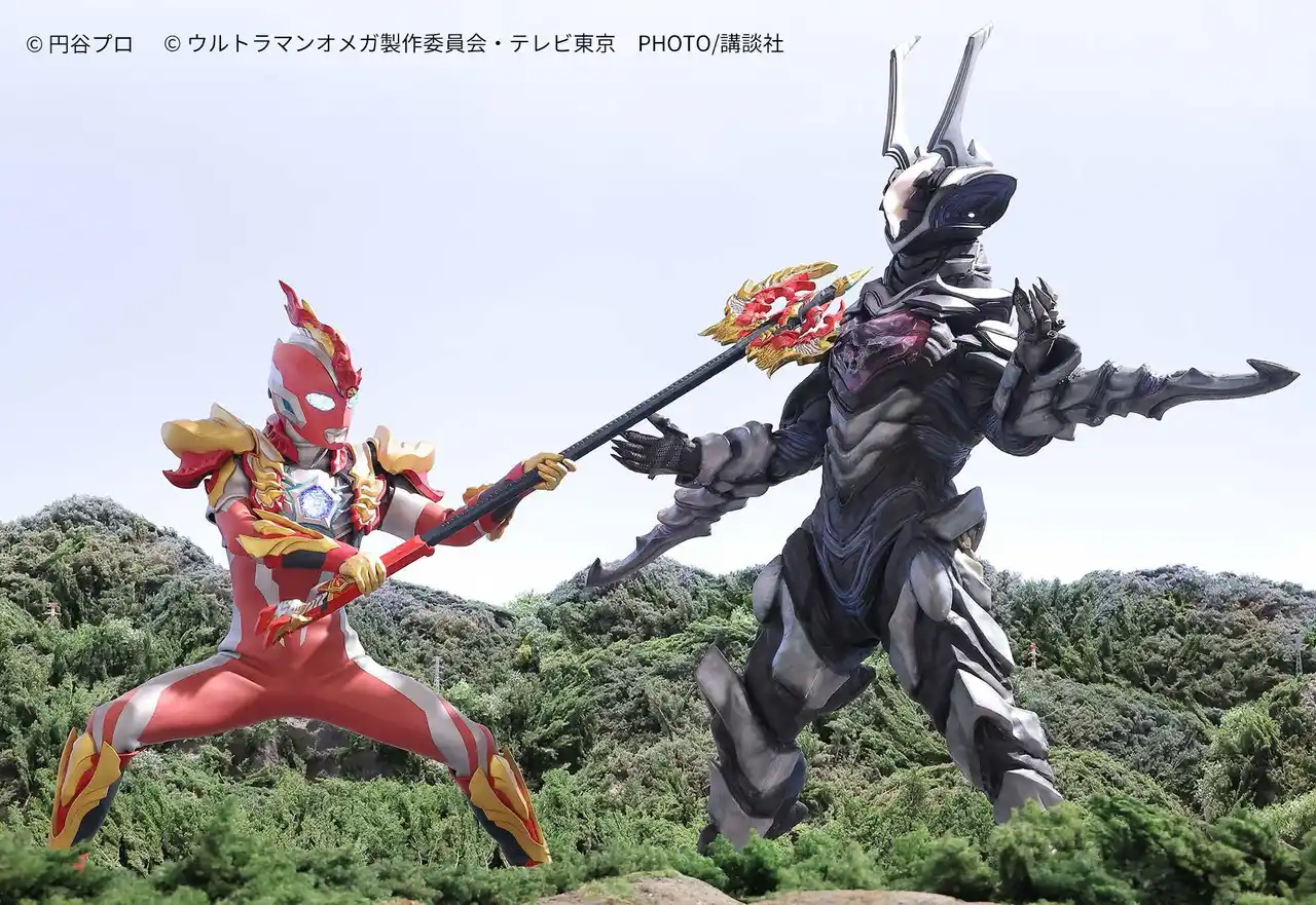 殲滅創世体ゾヴァラス(右)にヴァルジェネスハルバードを突き付ける、ウルトラマンオメガ ヴァルジェネスアーマー。 |
